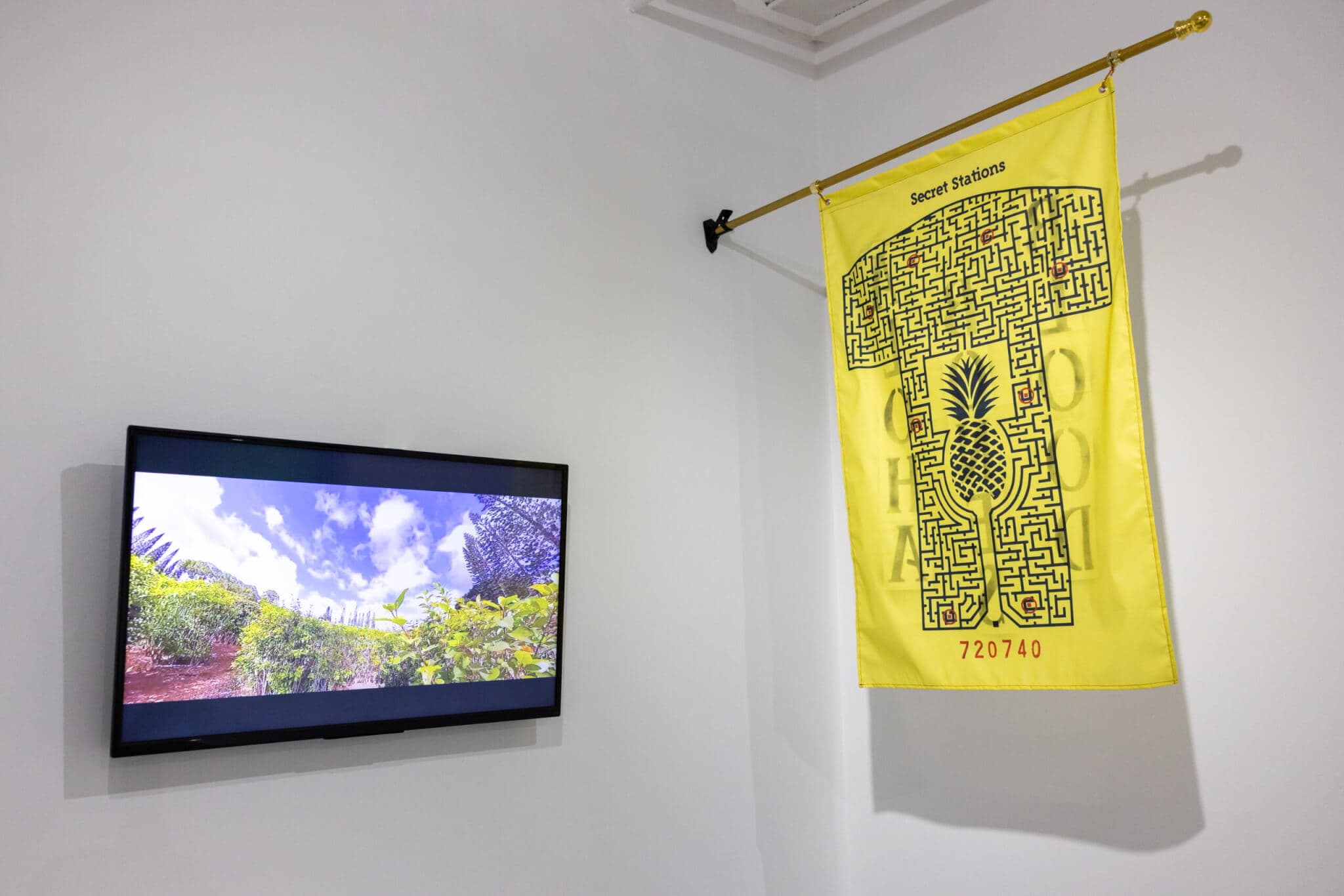 In “Secret Stations: Bango 720740,” Lani Asunción implicates us, the viewers, with a reminder that as Americans, we too have contributed to the erasure of native Hawaiians and the violence that propels the United States’ colonization process. The caution-tape-yellow flag hangs horizontally from a gold flagpole, and this metallic impermeability calls back to the military occupation of Hawaii. In the center stands a boldly printed pineapple, almost ominous, surrounded by a maze created to entertain visitors at the Dole plantation, which emerged as a US corporate enterprise after the overthrowing of the Hawaiian government and sold pineapples as exotic, commodifying Native Hawaiian values. Asunción took the map of a scavenger hunt within the maze for children and shows the eight targets in the same scarlet as the number of the tour she took when she visited, 720740, at the bottom. On the back of the flag, the words “BLOOD, BONES, Aloha!” cast shadows through the fabric—the reality of the plantation showing through the “fun” facade. As we take this in, Asunción turns the act of searching back onto us, forcing us to complete the scavenger hunt and replicate the experience of tourists to the plantation. Although we stand in Massachusetts, after being endowed with the ticketed number at the bottom and seeing the video tour of the plantation, we feel as if we are also arriving at the plantation, participating in the violence involved. As the flag towers over us, it reflects the nature of the plantation: overshadowing native Hawaiians and remaining as a reminder of its dark legacy.