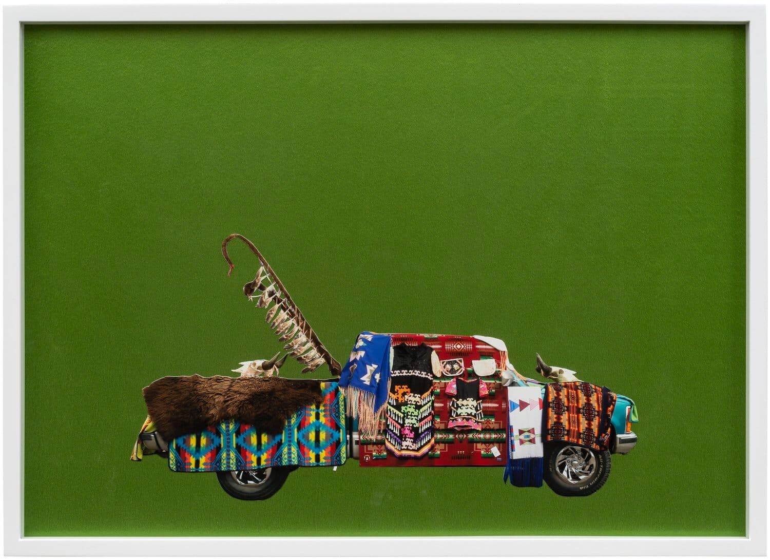 Wendy Red Star’s A Float for the Future (2021), featured in the “Fluid Matters, Grounded Bodies: Decolonizing Ecological Encounters” exhibition at the Northeastern University Gallery 360, consists of four successive images of a truck steeped in Native American (Apsáalooke) regalia. The vehicles—typically horses in the traditional Crow Fair parade this work reimagines—are long, spacious, and the types often seen toting American flags. However, make, model, and the drivers themselves are obscured by colorful textiles overwriting conventional American touchstones. With each depiction, Red Star—by reclaiming aspects of a culture that has historically marginalized her own—presents a middle ground between Indigenous traditions and the ingenuity required for their preservation.