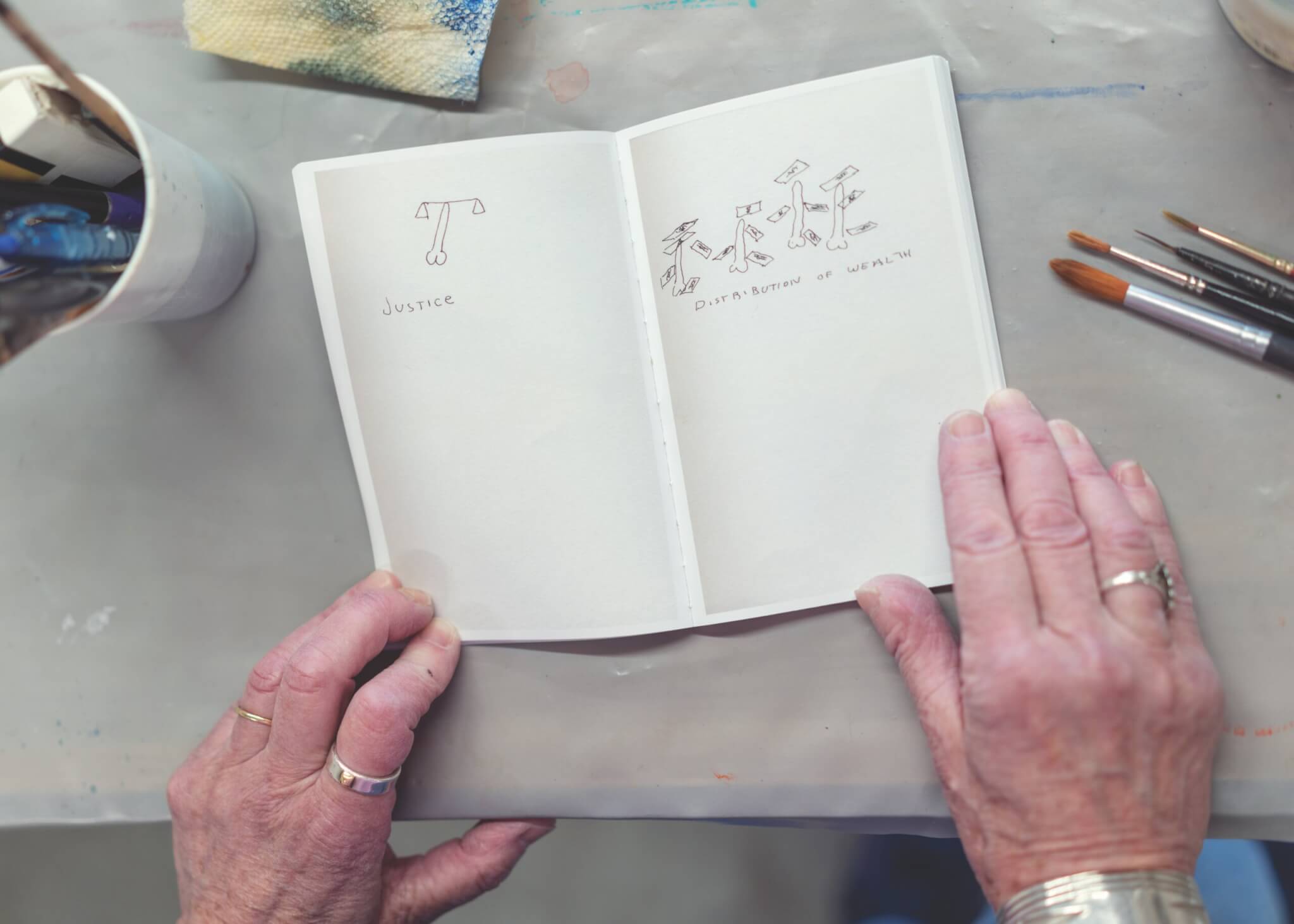 Jo Ann found Michelle at the end of the program to say how much the conversation had resonated with her. A few weeks later, she sent a copy of her spicy manifesto, The Book of Penis!, to the museum. It’s full of tongue-in-cheek (and beautifully sketched) drawings of penises in various heroic scenarios (a penile depiction of Saint Sebastian riddled with arrows is a standout). As her emphatic postscript explains: “As a young painter I imagined that the quality of my work would exempt me from the prejudice and constriction suffered by earlier generations of women artists. It did not. In 1982 I gathered statistics comparing teaching positions, reviews, and exhibitions of women and men in Boston. They were unequal. I thought about that until it seemed funny.”