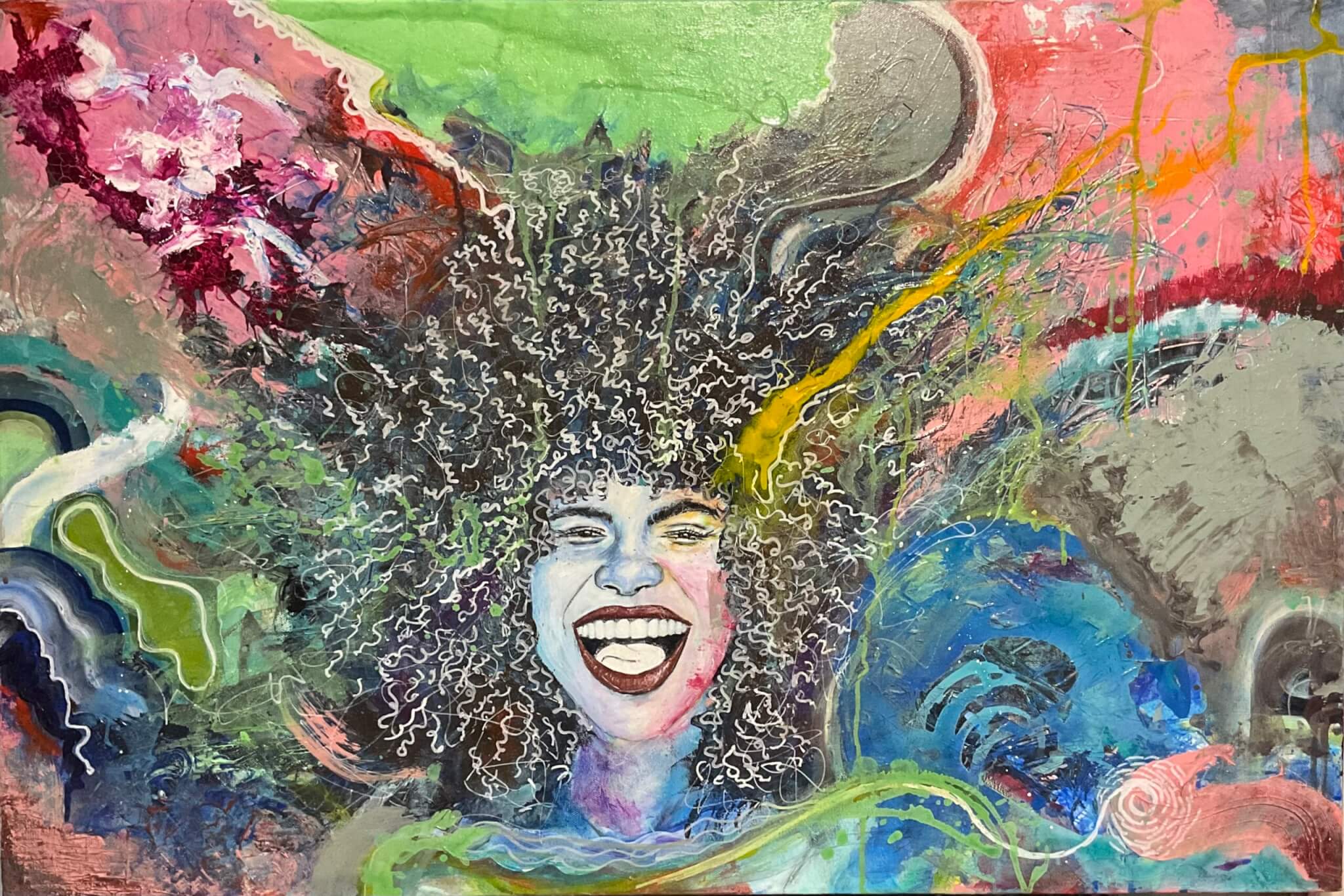 Ani Jacsmile Cassion, Joy, 2023. Acrylic on canvas. 24″ x 36″. Photo courtesy of the artist.