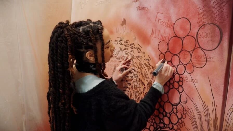 Attendees writing additional intentions for the Black Diaspora on the I AM canvas next to artist Sagie Vangelina (bottom left). Photo by Niara Hightower.