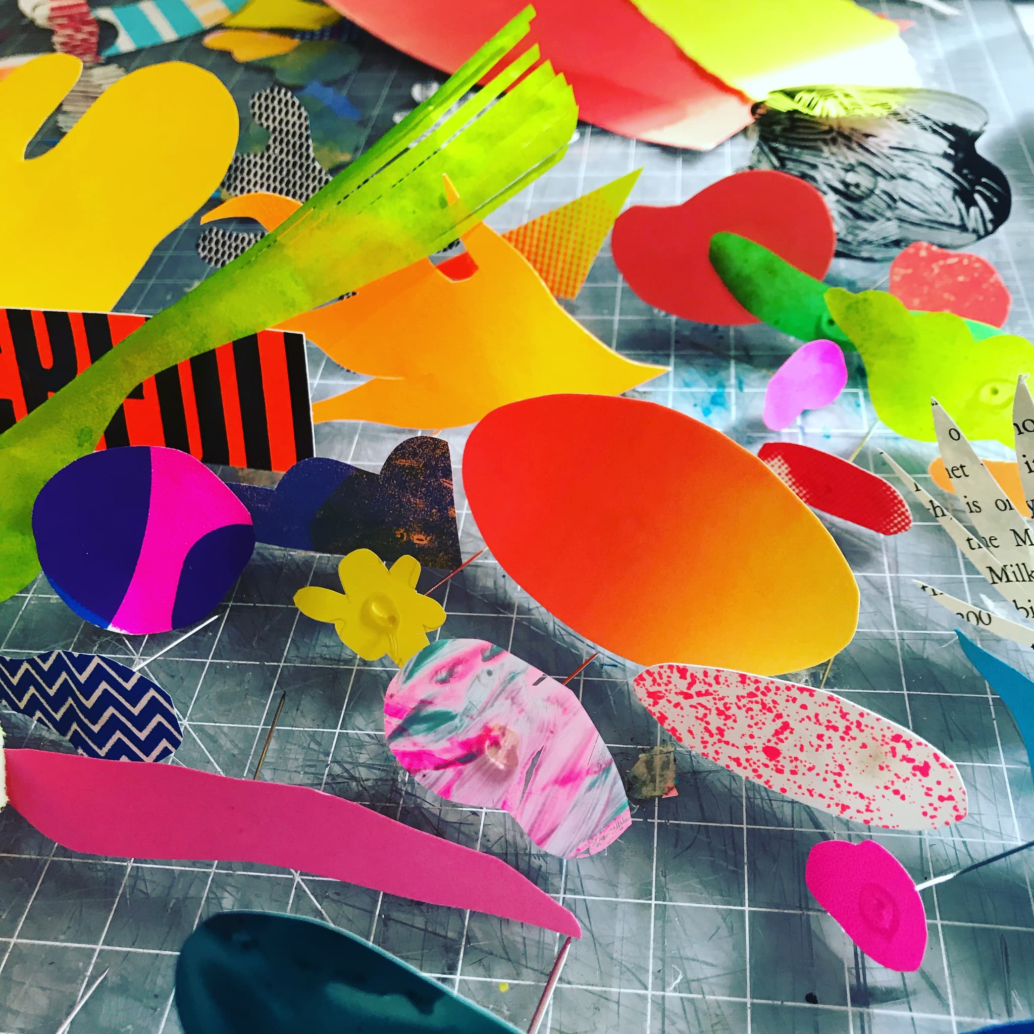 “I’ve been trying to keep away from purely digital work,” Erdelyi notes. “Partly I think it’s just because I have this background with craft and working with my hands and touching things, so I consider the work I’m doing a hybrid animation process. It’s analog and digital combined.” That’s also true of her second work in the exhibit, a new wall piece called Ma Femme Maison (2019) that presents two exuberant collages connected by a hot-pink umbilical cord. These riotous forms arise from found papers and monoprint scraps that have been carefully cut like lace, bored with holes like Swiss cheese, or fashioned into orbs, organs, feathers, and flowers. Most of the colors are neon-bright hues hard to find in nature, but the shapes are organic, by turns botanical, aquatic, anatomical, cosmic. Each wild yet delicate assemblage surrounds a small LED screen that plays looping animations inspired by nineteenth-century drawings of developing embryos.