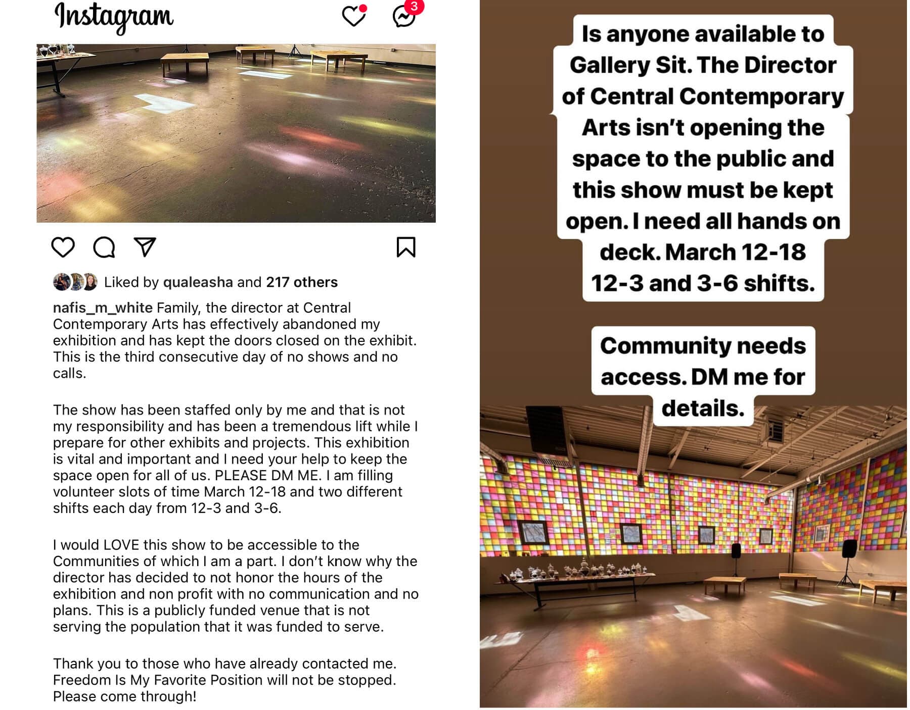 As of 12:02 PM on March 15, the CCA instagram (@centralcontemporaryarts) is no longer available. It appears to have been deactivated. White reacted to the deactivation in her Instagram stories, stating, “They [CCA] erased everything community said, they erased the amazing posts by W.A.G.E.; this is erasure, and this is the playbook.” She also maintained “we’re not closing the gallery,” stating that her gallerist was currently welcoming guests at CCA. White also reiterated that visitors should “pull up Saturday.” The artist continued: “Bring non-alcoholic beverages; bring things to share; bring food to share. I’m working on getting donations of food, if any of you all have folks that we can reach out to for food donations. We’ll pull out tables in the gallery space, and like music pumping. Saturday […] we need hundreds of people in the gallery, getting into that work, and meeting each other.”