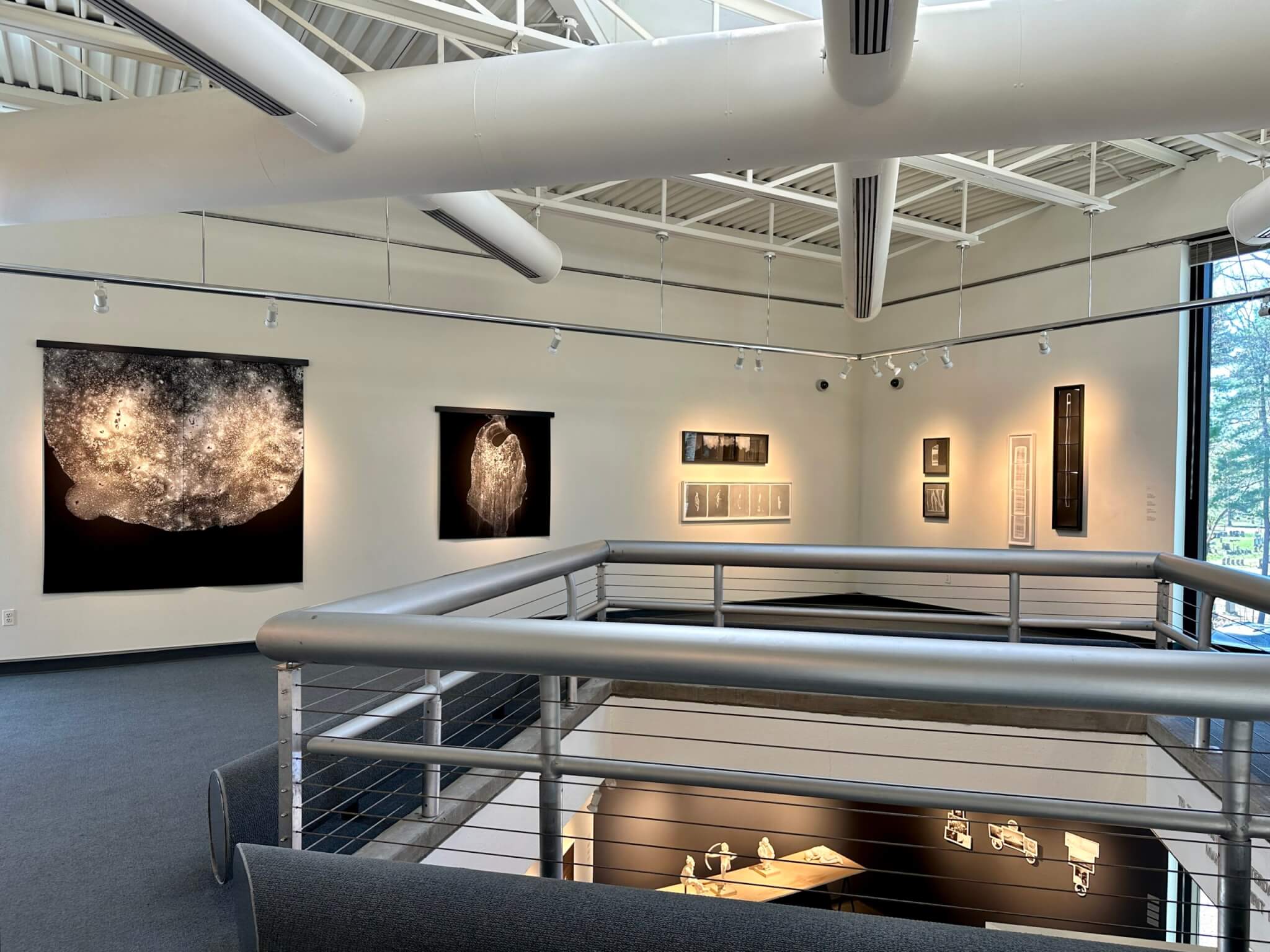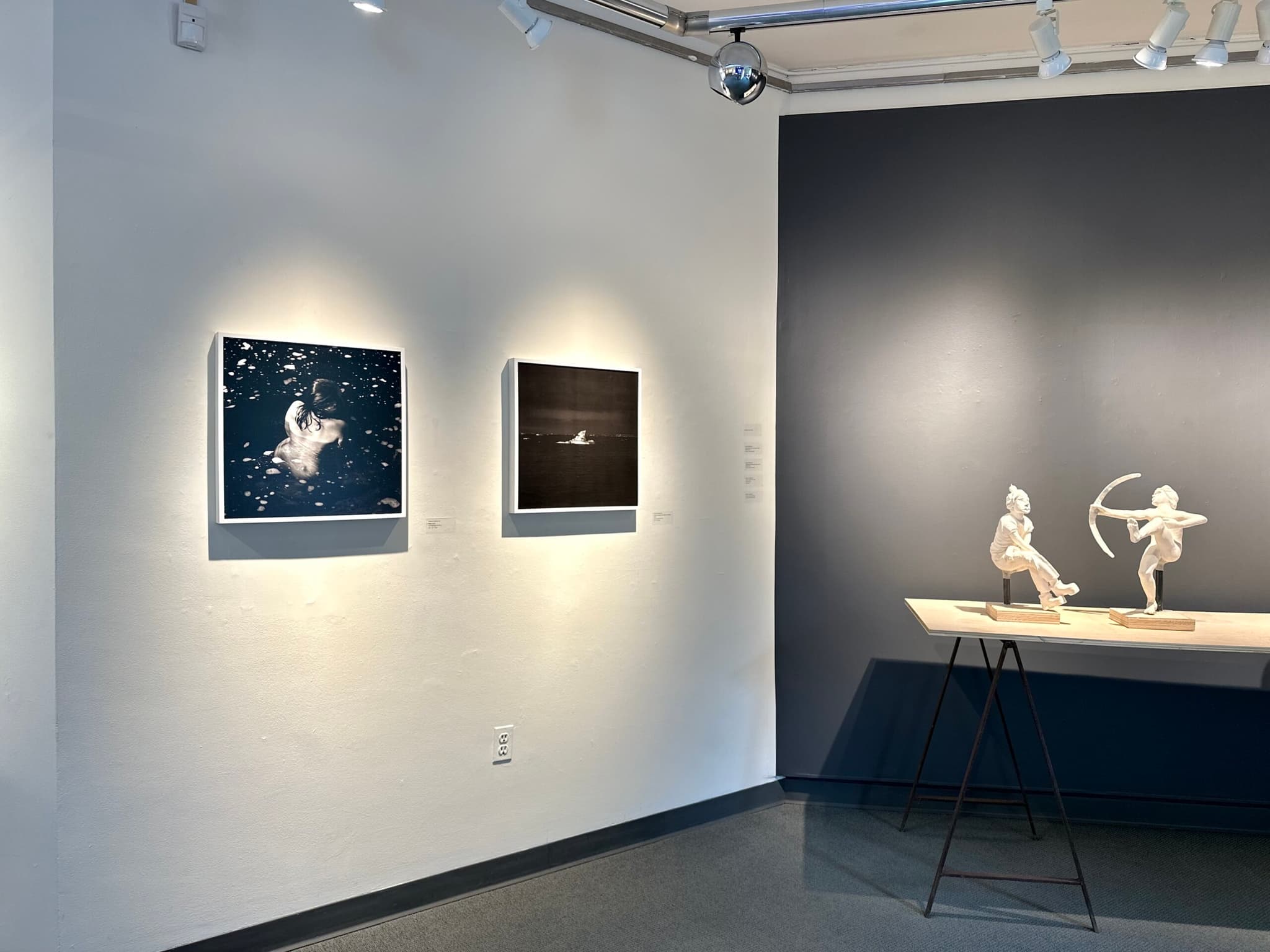 Installation view of Kathryn McElearney’s photographs Deep Water (2025) and A Snail Crawling on the Edge of a Straight Razor (2025), along with sculptures, “Circle of the Sun,” at the art gallery of the University of New England in Portland, 2025. Photo courtesy of UNE Art Gallery.