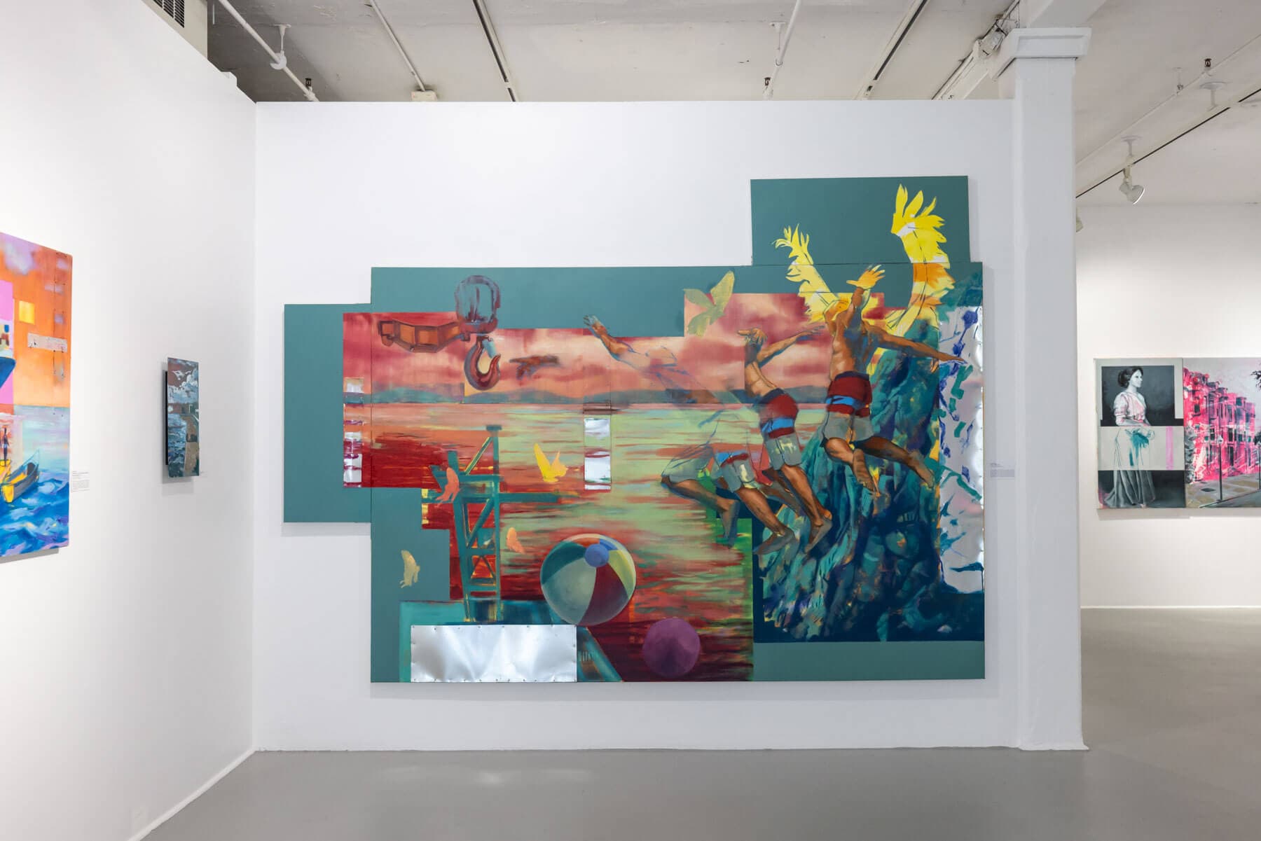 Andrae Green, Icarus II: Flight, 2025. Oil and acrylic on aluminum and canvas, 128 x 92 inches. Installation view, “Paradise/Mash-Up: Andrae Green,” Boston Center for the Arts, 2025. Photo by Melissa Blackall. Courtesy of Boston Center for the Arts.