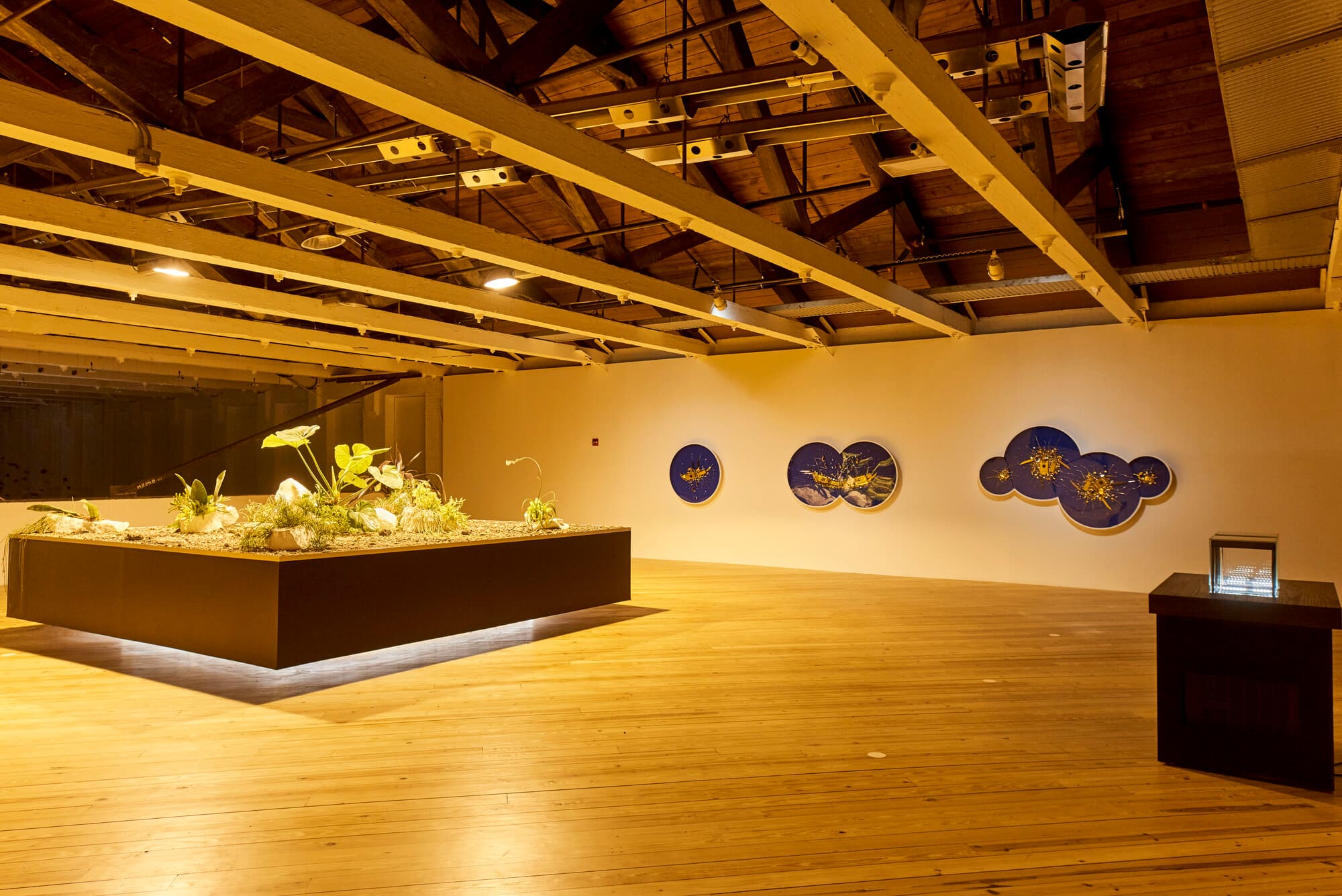 Glenn Kaino's installation displayed in a room with a wooden floor, hanging sculptural work, and a series of lights.