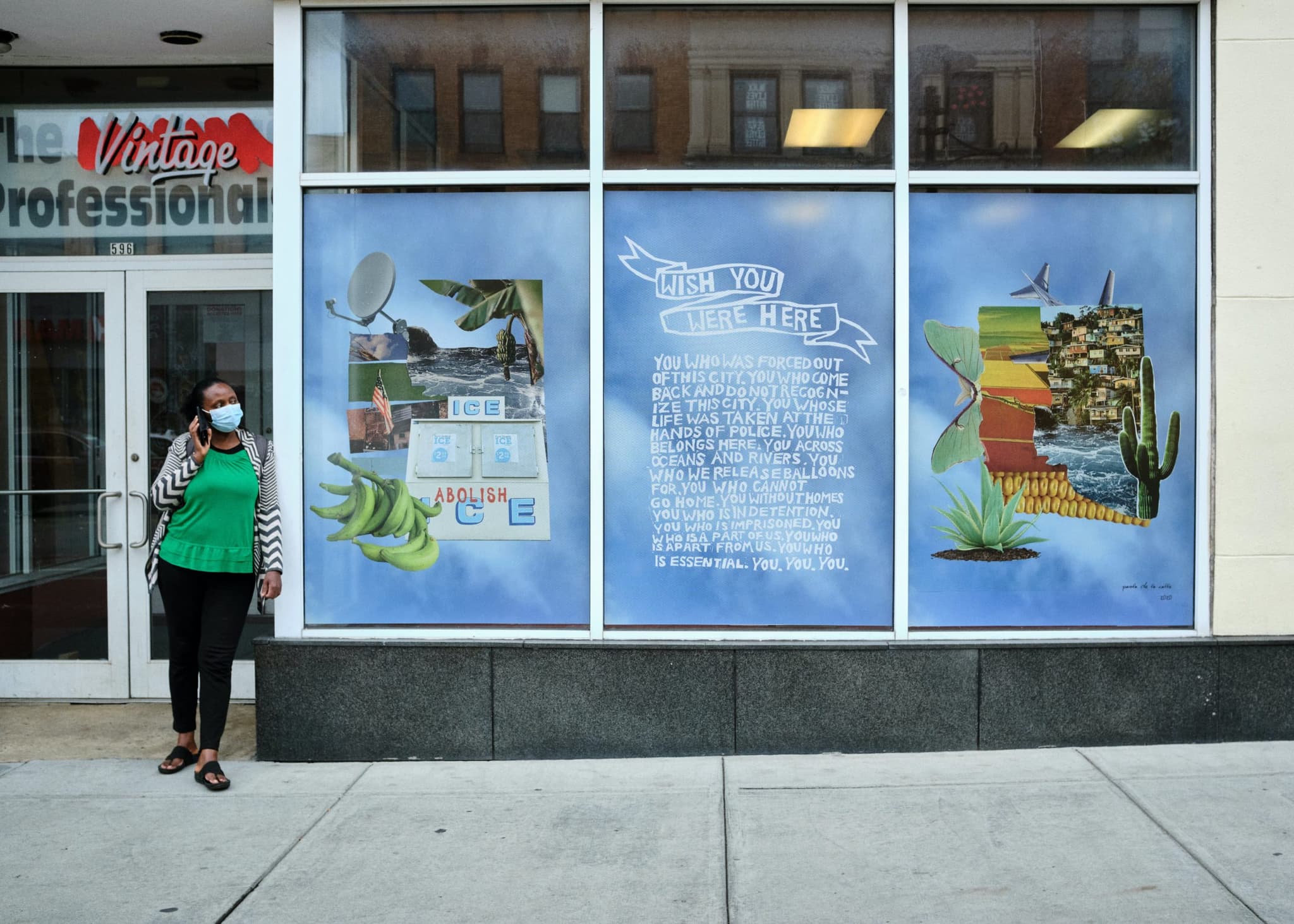 While the visuals themselves play a key role in planting those seeds, the text and poetry she includes help to guide viewers into understanding the meaning behind the work. The “Wish You Were Here” panel captures the strong emotions that drove the piece. “All of the text there is hand-carved on linoleum and then printed on paper and then photographed and digitally altered to fit into those dimensions,” explains de la Calle. “The long process of carving ‘You who was forced out of this city’ and naming who isn’t here that I wish was… I think that was a really good release of what I was holding in and feeling really angry about for a really long time,” she says. “And not that it doesn’t still make me angry, but I like that it’s still there; people not from Cambridge stop and read it and people that are from here and can relate to missing folks who fit in that little tiny poem are reading it too.”