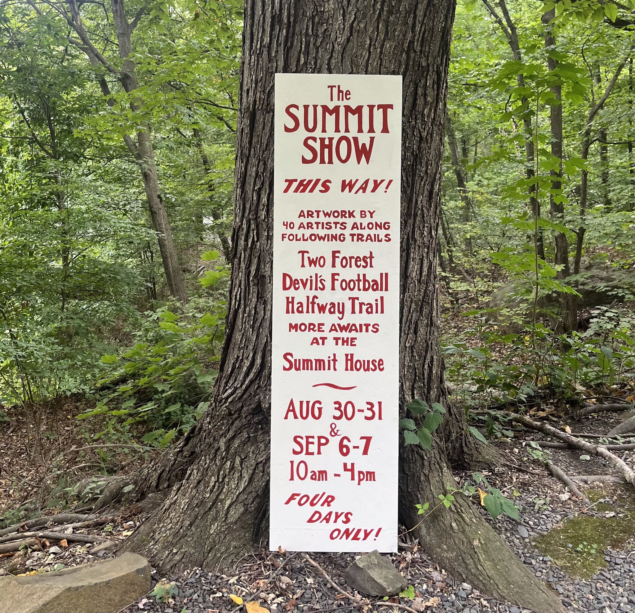Signage directs viewers toward the trails for “The Summit Show.” Hand-painted by Elliot Hartman-Russel. Photo by and courtesy of Charlotte and Emma Kohlmann.